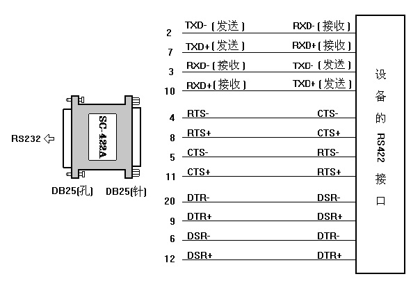 RS232/RS422轉(zhuǎn)換器,無需供電,除傳送TXD、RXD外,還傳送RTS、CTS和DTR、DSR信號,最高速率57.6Kbps。