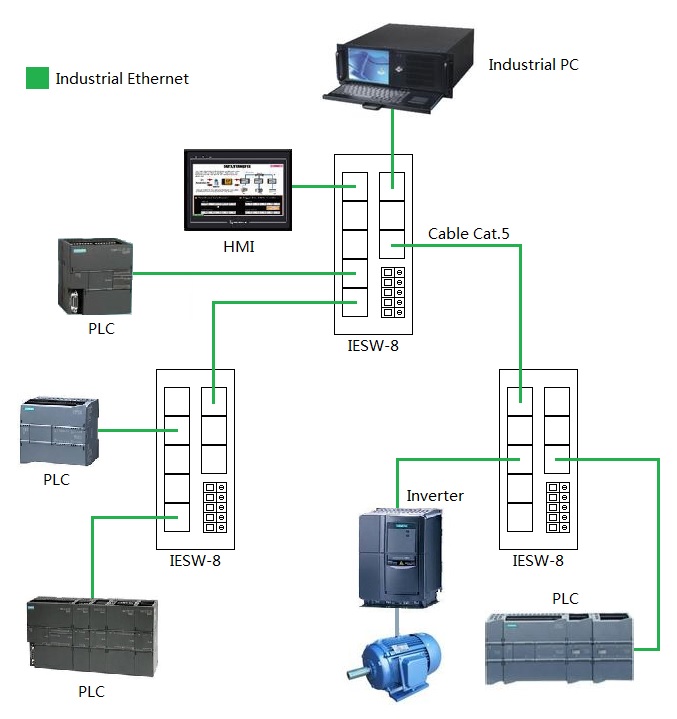 工業級8口非網管工業以太網交換機。符合IEEE802.3, 10/100Base-TX工業以太網標準,網口速率10/100M自適應,具有廣播風暴抑制功能,帶有電源、以太網端口狀態指示燈。各網口之間及電源端口相互隔離,工業級標準設計,DIN35mm標準導軌安裝或螺栓固定安裝,-20~+75℃工業級寬溫型。可廣泛的用于PLC、HMI、VVVF、DCS等各種基于工業以太網的工控設備。