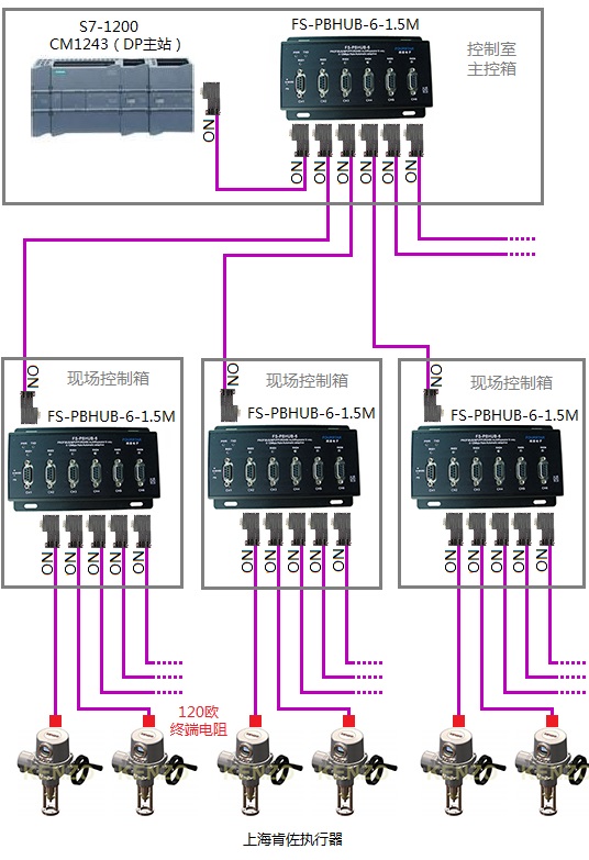 1、采用PROFIBUS集線器走星型連接拓?fù)洌瑢⒎稚⒏魈幍膹恼緢?zhí)行器的PROFIBUS信號(hào)通過集線器匯聚到S7-1200主站,網(wǎng)絡(luò)拓?fù)淝逦阌诠收吓懦驮O(shè)備維修。如圖1所示。