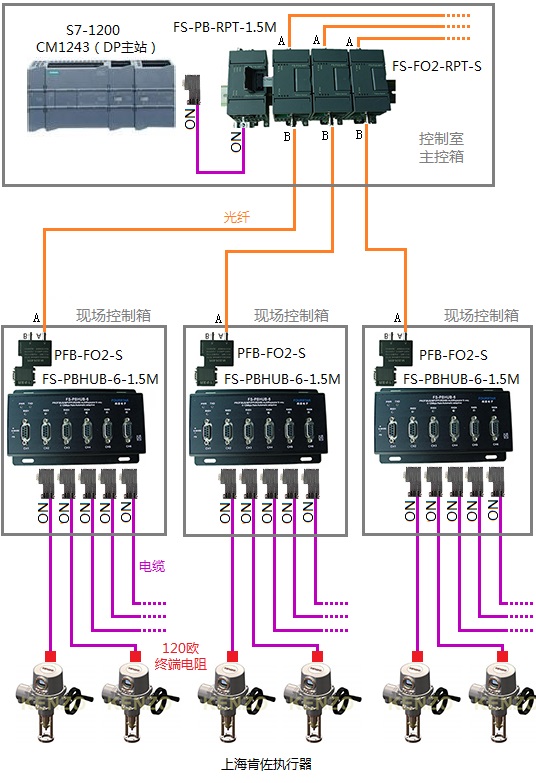 2、采用PROFIBUS集線器加光纖HUB的方案: