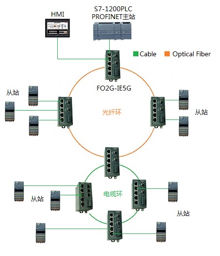德陽四星電子技術有限公司的8口千兆環網交換機IESW-8G和2光5電千兆環網交換機FO2G-IE5G-S,支持PROFINET等工業以太網,并支持單環、雙環和多環等環網拓撲,在網絡拓撲組態時,只需將其視為一根電纜,而不是作為設備參與組態。下面是用于西門子S7-1200PLC和S7-1500PLC的PROFINET RT的應用實例: