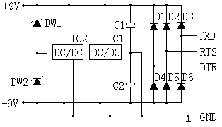 本裝置不需外接電源,其工作電源從RS232接口上竊取。如圖4所示:圖中TXD、RTS、DTR是RS232的輸出信號,每根信號線可提供約9mA的輸出電源,通訊時其電壓在+10V和-10V之間跳變,通訊停止后其電壓極性不定,但開機(jī)上電時全部為-10V。該三個信號經(jīng)D1~D6全波整流和C1、C2濾波后得到+9V和-9V直流電壓,若是開機(jī)上電狀態(tài)則只有-9V電壓。IC1和IC2分別是負(fù)電壓到正電壓轉(zhuǎn)換器和正電壓到負(fù)電壓轉(zhuǎn)換器,將輸入電壓轉(zhuǎn)換極性并升壓,這樣無論TXD、RTS、DTR是什么極性都能在DW1和DW2端得到+9V和-9V的穩(wěn)定電壓。亦即不需靠軟件設(shè)置來得到工作電壓,確保適合所有軟件!其實只需以上任意一根信號線即可滿足要求。