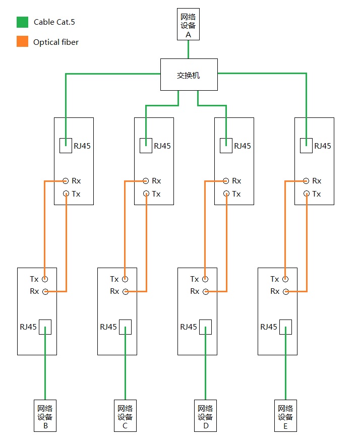 ● 最大傳輸距離:五類雙絞線(Cat.5)100米,多模光纖5千米。