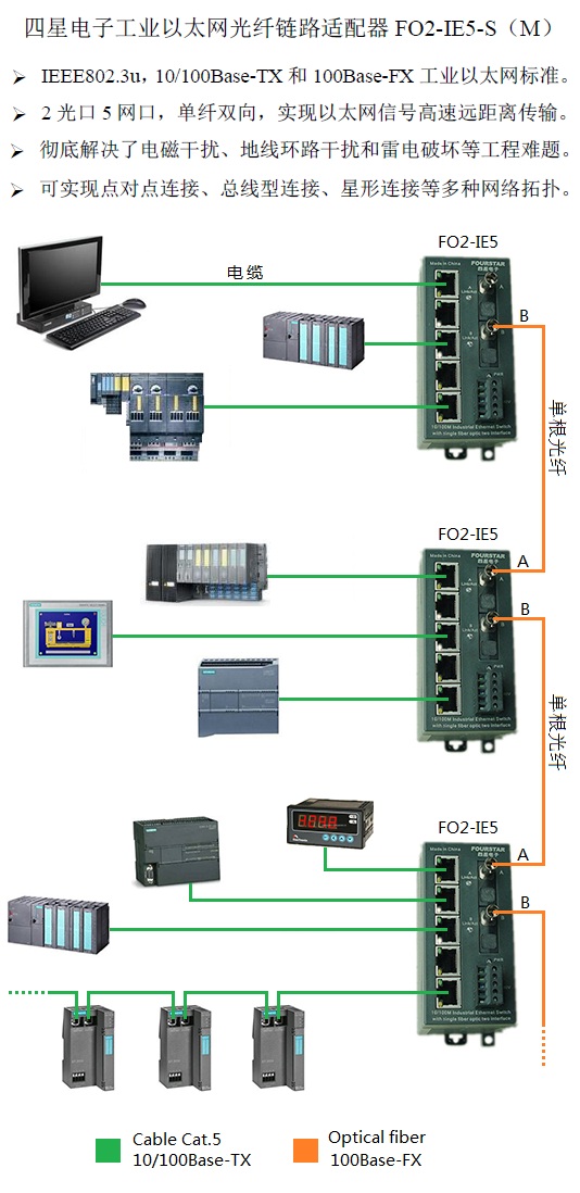 單纖2光5電工業以太網單模光纖鏈路適配器。2對單纖接口和5個RJ45以太網交換機電接口,符合IEEE802.3u,10/100Base-TX和100Base-FX工業以太網標準,網口速率10/100M自適應,光口速率100M,電源端口-網口-光纖端口全部隔離,光纖接頭標配ST接頭,適用光纖:單模9/125、10/125、8.3/125um,最大傳輸距離20km。DIN35mm標準導軌安裝或螺栓固定安裝,-20~+75℃工業級寬溫型。