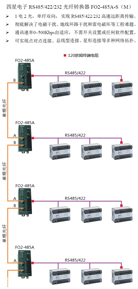 單纖雙光口RS485/422/232多模光纖鏈路模塊。1電2光,單纖傳輸,實現RS485/422/232信號高速遠距離傳輸,徹底解決通訊中的電磁干擾、地線環路干擾和雷電破壞等工程難題。可實現點對點、總線型、星形和混合型光纖網絡。數據透明傳輸,無需改動原有的通信協議和軟件,速率0~500Kbps自動適應,9~40VDC寬電壓隔離供電,適用光纖:多模62.5/125um、50/125um,光纖傳輸距離:0~2km,ST光纖接頭,-40~+85℃工業級工作溫度,DIN35mm標準導軌安裝。