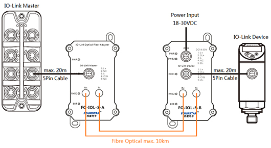 IO-Link轉光纖適配器。分為A、B兩個模塊,成對使用,適用光纖:單模9/125、10/125、8.3/125um,最大傳輸距離10km,ST光纖接頭。通訊速率COM1(4.8Kbps)、COM2(38.4Kbps)、COM3(230.4Kbps)自適應,支持IO-Link、SIO、A類端口、B類端口多種工作方式,即插即用免設置,18V~30VDC寬電壓供電,IP65防護等級。