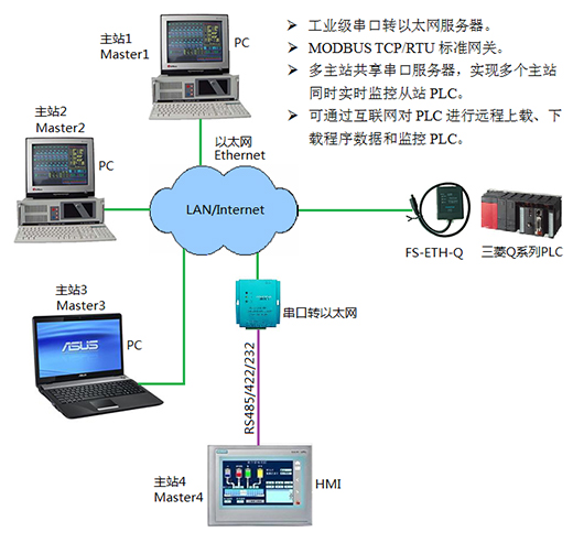 三菱Q系列PLC串口轉以太網適配器。用于將Q系列PLC通過RS232編程口連入以太網或互聯網,不改變現有通訊協議和軟件。并支持多達96個主站(如計算機、觸摸屏、PLC主站等。)同時實時監控PLC,還可通過互聯網異地遠程操控維護PLC。工業級設計,網口-串口隔離,-40~+85C工作溫度,DIN35標準導軌安裝。